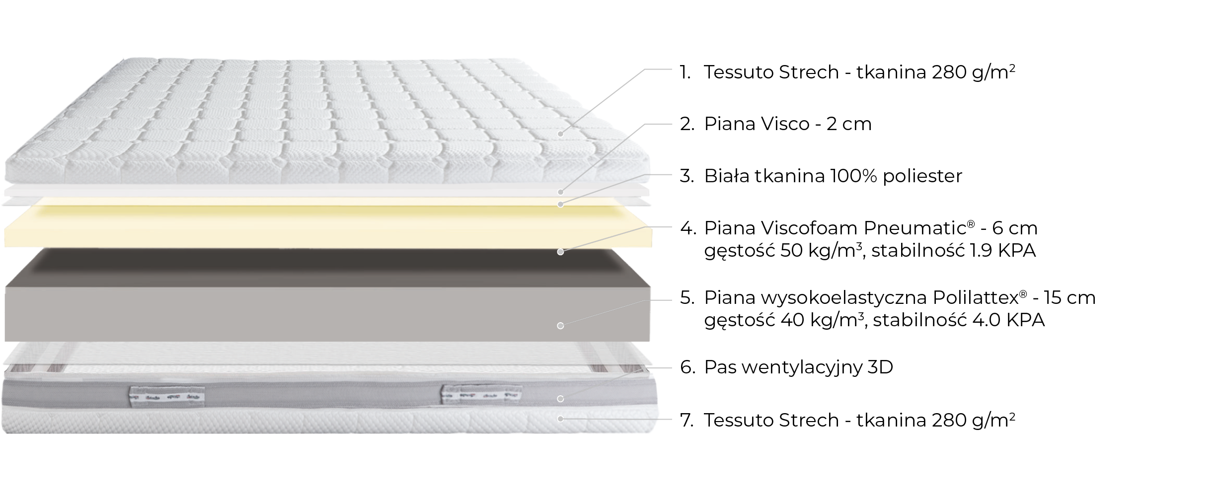 tworzy piana o wysokiej gęstości, zapewniająca trwałość i odporność na duże obciążenia. Wierzchnia warstwa materaca została